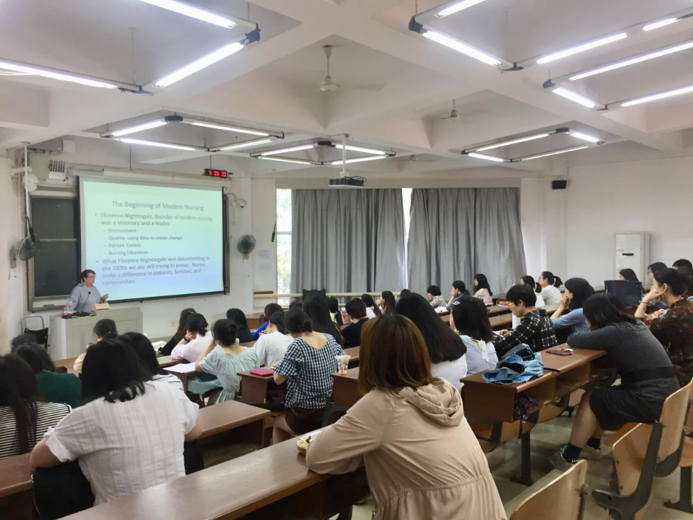 讲座开始,Mary Foley教授以南丁格尔对护理安全的贡献为切入点介绍了现代护理的起源,指出护士可以对患者、家庭以及社区作出巨大的贡献。随后Mary Foley教授简要介绍了美国和世界卫生组织的主要安全报告,她特别强调,目前医疗事故是美国排名第三的致死因素,这说明在安全措施方面还有非常大的改善空间。接着,Mary Foley教授向大家介绍了“患者安全中心照护”的理念,指出质量和患者安全是卫生保健团队每个成员的首要任务和责任。最后,Mary Foley教授通过分享自己的临床及研究经验,多方面介绍了护士该如何有效确保照护质量和患者的安全,她特别指出,理想的健康照护是需要默契的团队合作达成的,而交流更是必不可少的过程。