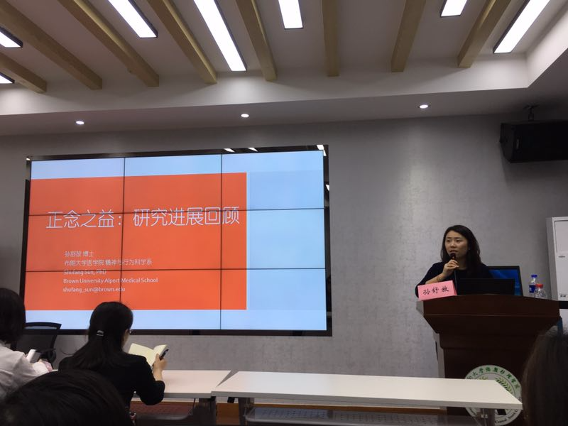 本次讲座主讲人为布朗大学医学院博士后,临床心理学家孙舒放博士。孙博士从威斯康星-麦迪逊大学获得咨询心理学博士学位,并在包括威斯康星大学、埃默里大学医学院、布朗大学医学院等多所大学中开展以正念为基础的干预性研究并教授正念疗法。在她的研究中,其干预人群包括了老员工、HIV感染者、复健期病人以及精神科病人等。