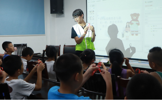 当日下午,成员栾云龙为孩子们讲述了山西临汾红丝带学校的郭小平的故事,并走下讲台,耐心询问孩子们的观后感。“他们很可怜”,“没有别的学校愿意接收他们吗”孩子们七嘴八舌,很快被吸引到艾滋病孤儿的问题上来。栾老师就孩子们的想法做了进一步延伸,提出自爱和爱人是对待艾滋病孤儿的好办法。随后,就艾滋病的传播途径和感染现状与预防进行讲解。最后,栾老师现场示范红丝带标志的制作过程,并给孩子们分发材料指导孩子们动手制作,孩子们纷纷将做好的红丝带佩戴在胸前。