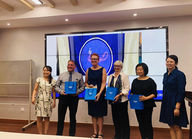讲座最后,Eillen Sullivan Marx教授仔细回答了参会老师提出的问题,李现红教授和王红红教授为主讲人和嘉宾派发纪念品。全体参会人员合影留念,讲座在热烈的掌声中圆满结束。