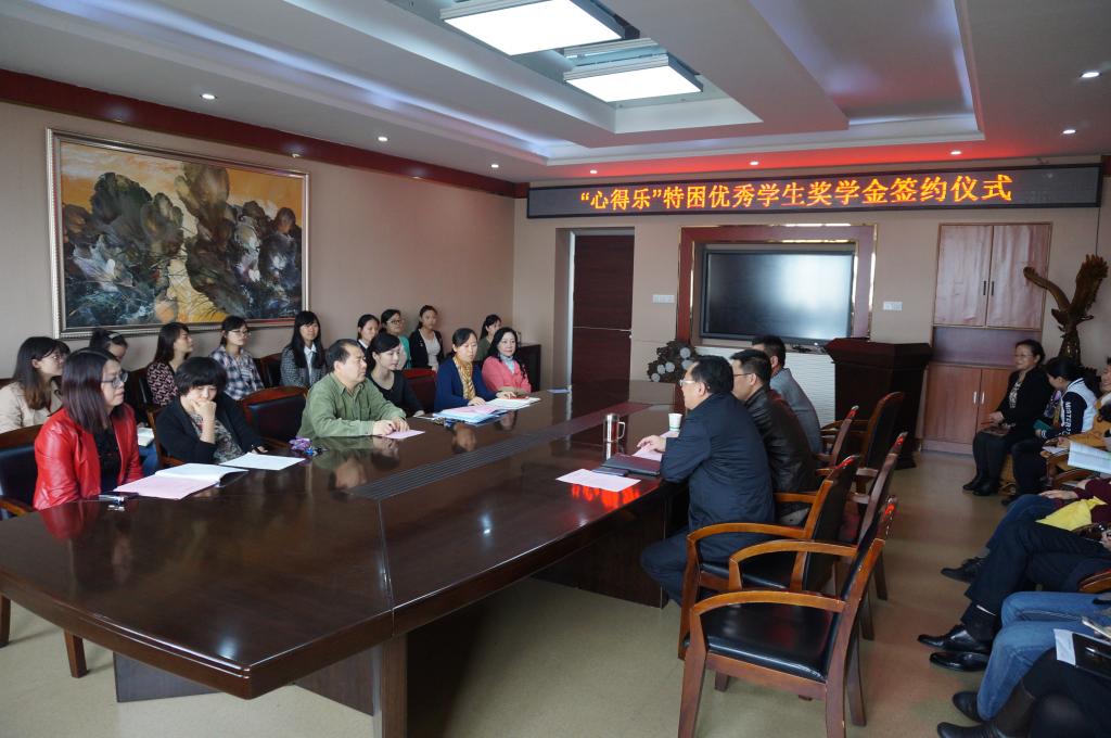 4月22日,威廉希尔中文官网“心得乐特困优秀员工奖学金”捐赠签约仪式在学院637会议室举行。“心得乐”特困优秀员工奖学金由公司员工吴仪先生捐赠设立,旨在奖励威廉希尔中文官网家庭较为困难、品学兼优的员工,奖励金额十五万元,每年三万,设奖五年。“心得乐“特困优秀奖学金设奖人吴仪先生、威廉希尔中文官网经理唐四元、书记罗军飞、学院师生代表出席签约仪式。仪式由罗军飞书记主持。