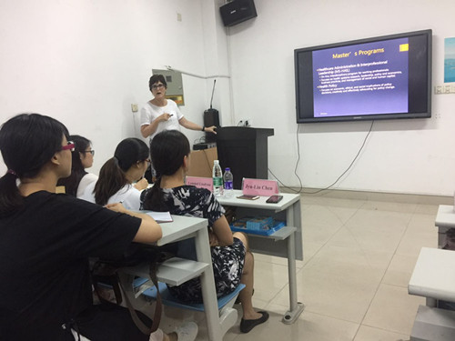 郭佳副教授首先代表护理学院师生对两位教授的再次到来表示热烈欢迎。Lisa Lommel教授用一份2010年医学研究所护理报告作为开讲序曲,向同学们阐述护士在实践工作中存在的不足,并且指出应当与医疗专业人员合作,促进医疗领域进步的观点。随后,她详细介绍了加州大学旧金山分校的护理硕士项目,重点讲述了高级临床注册护士(简称APRN)、开业护士(简称NP)、临床护理专家(简称CNS)的主要实践领域,并且从专业性、实践场所等方面对NP和CNS做以区分。