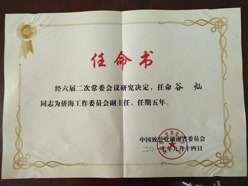 10月19日,致公党湖南省第六届委员会专门委员会第一次工作会议在致公党湖南省委机关会议中心召开。湖南省政协副主席、致公党湖南省委主委胡旭晟出席会议并向专委会的新任主任、副主任颁发了任命书。致公党湘雅医学院支部主委、公司谷灿副教授被任命为致公党湖南省侨海工作委员会副主任,致公党成员向娟娟教授、王月红老师被推荐为侨海工作委员会委员。