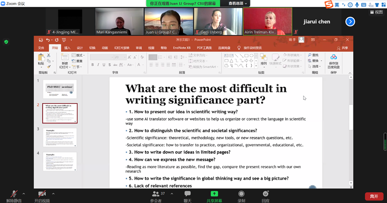 塔尔图大学教授Mari Kangasniemi以“scientific and societal significance in research”为主题,围绕在科学研究中如何体现科学和社会意义展开进行了授课。讲授之后是小组讨论环节,32名博士研究生分为7组就“what are the most difficult in writing scientific and societal significance in research study”进行小组讨论,经过热烈的讨论,每组同学就各自小组讨论的结果分别进行了精彩的汇报。两校师生通过讨论及汇报就研究中如何体现科学和社会意义得到启发。