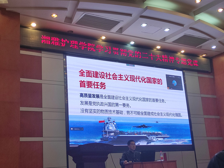 刘新庚采用图文讲解与视频播放相结合的方式,联系实际,深入浅出地从党的二十大报告结构的十五个组成部分、大会主题与金句赏析、中国式现代化推进伟大复兴的战略部署三个方面展开党的二十大精神解读。在简要讲授过去“5年工作和新时代10年伟大变革”、“马克思主义中国化时代化”、“党的任务使命”、“全面从严治党”等十五个方面内容的基础上,刘新庚重点对“三个‘务必’”、“极不寻常、极不平凡的五年”、“十年来的三件大事”、“五个‘必由之路’”等金句进行了深入解读,号召广大党员同志坚定信心,同心同德,埋头苦干,奋勇前进,为全面建设社会主义现代化国家、全面推进中华民族伟大复兴而团结奋斗。刘新庚还强调,学习宣传贯彻党的二十大精神是当前和今后一个时期全党全国的首要政治任务,全院师生党员要在全面学习把握、全面把握、全面落实上下功夫。