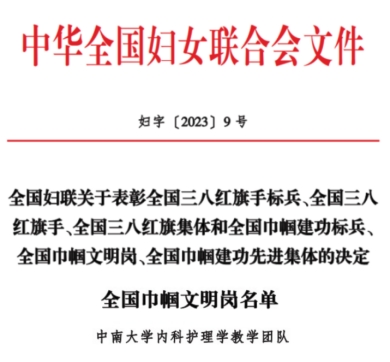 日前,全国妇联公布了2022年度全国巾帼文明岗名单,威廉希尔中文官网内科护理学团队被全国妇联授予“全国巾帼文明岗”称号。