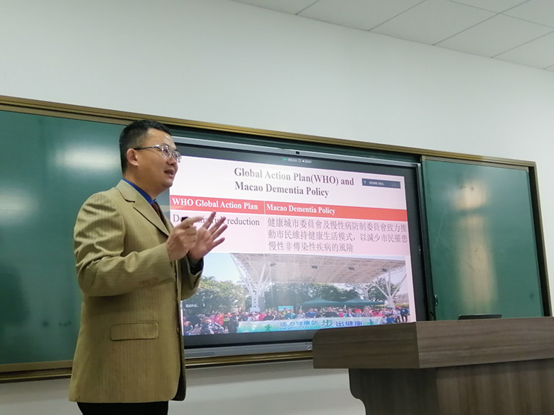 讲座伊始,主持人王红红教授简要介绍了本次活动的目的。随后,曾文博士从中华人民共和国澳门特别行政区老龄化现状、中国澳门如何依据世界卫生组织全球应对行动制定澳门失智症相关政策、中国澳门失智症服务内容和相关研究等方面,详细具体地向学者们展示了中国澳门如何实现失智症长者医疗服务与社区照护的无缝化衔接。他讲道:目前,中国澳门长者医疗服务主要分为三大模块,即设立老人科专科和老人科病房、拓展医疗服务网络、失智症服务。其中,失智症服务内容又包括设立失智症诊疗中心和构建失智症友善社区两个方面。