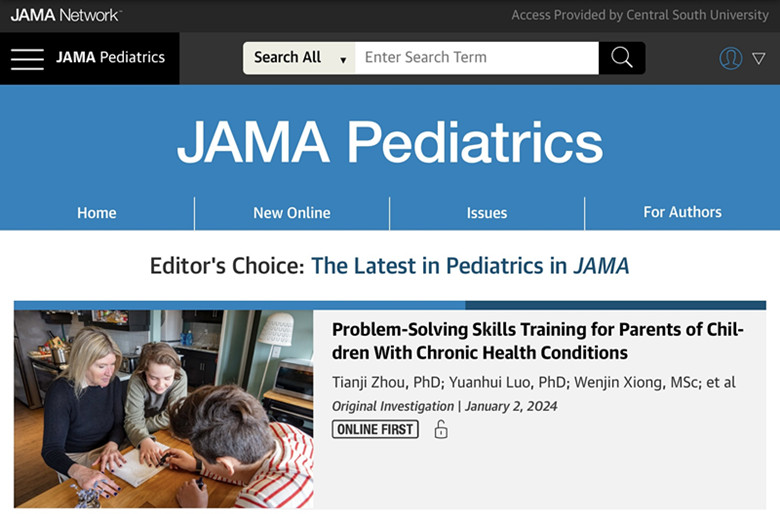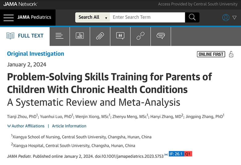 近日,威廉希尔中文官网张静平教授指导的精神心理护理研究团队在JAMA Pediatrics(IF:26.1)发表题为“Problem-solving Skills Training for Parents of Children with Chronic Health Conditions: A Systematic Review and Meta-analysis”的原创性论著,该论文同时被选为当期JAMA Pediatrics的编辑精选文章并荣登网站封面。威廉希尔中文官网2021级博士研究生周添吉为第一作者,罗媛慧讲师为通讯作者,张静平教授、2022级硕士研究生熊文进、孟震宇、湘雅医院2022级博士研究生张汉伊为共同作者。威廉希尔中文官网为该论文第一和通讯单位;williamhill中国官方网站湘雅循证卫生保健研究中心、JBI湘雅循证实践与健康创新中心提供咨询指导。该研究获得美国中华医学基金会资助。