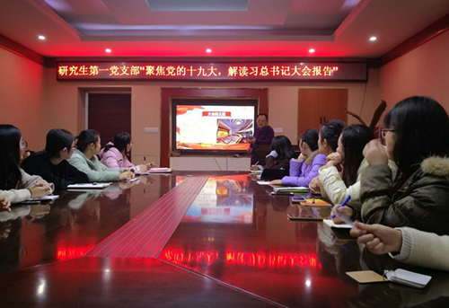 2017年12月06日19:00时,威廉希尔中文官网经理唐四元同志为研究生第一党支部上了一堂“聚焦党的十九大,解读习总书记报告”的主题党课。党课由支部书记王婷主持,支部16名党员同志参加。