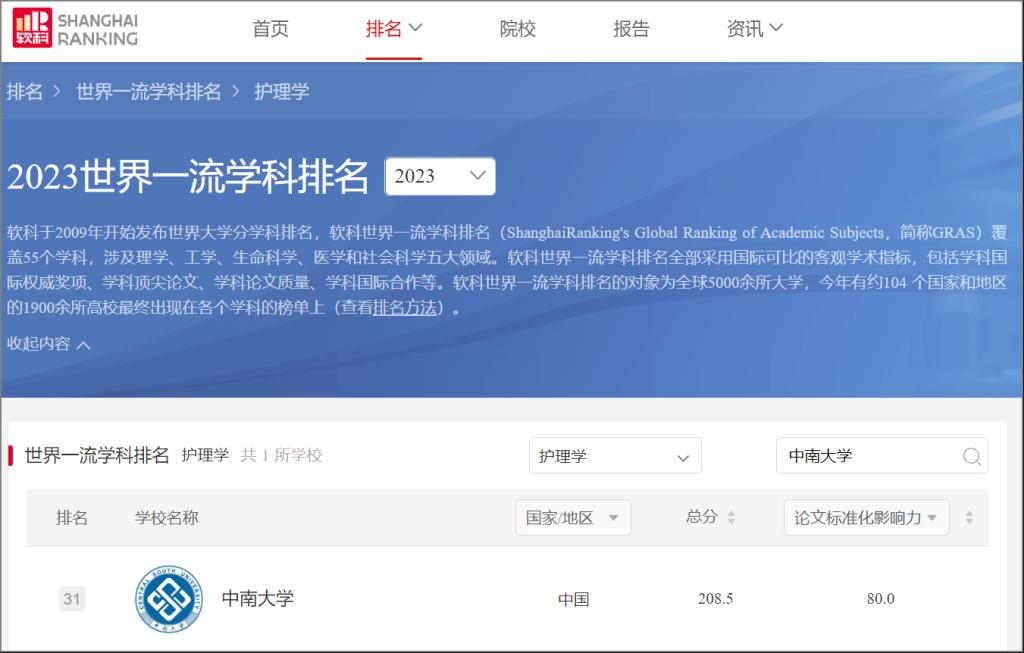 2023年10月27日,2023“软科世界一流学科排名”(ShanghaiRanking's Global Ranking of Academic Subjects)正式发布,williamhill中国官方网站护理学排名第31位,是继2022年51-75位的再次提升。本次排名指标包括:重要期刊论文数(Q1)、论文标准化影响力(CNCI)、国际合作论文比例(IC)、顶尖期刊论文数(Top)、教师获权威奖项数(Award)。williamhill中国官方网站护理学在重要期刊论文数、论文标准化影响力、国际合作论文比例、顶尖期刊论文数方面具有....
