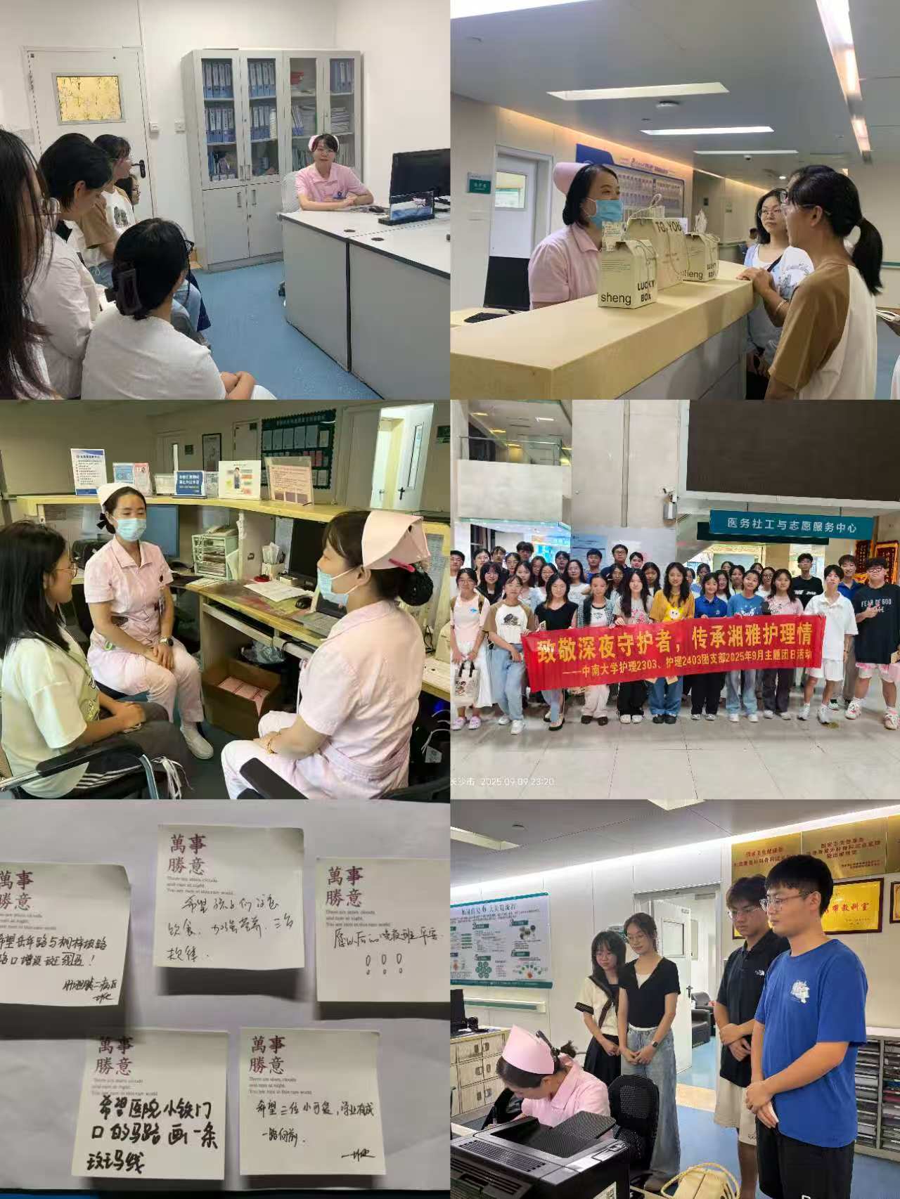 “夜班护士的坚守,是最生动的职业教材。”9月9日23:30,威廉希尔中文官网2303、2403团支部近40名学子走进湘雅三医院外科楼,开展“致敬深夜守护者,传承湘雅护理情”主题团日活动,用实际行动向晚夜班护士致以敬意。活动缘起于护理2303团支部同学们的见习感悟。在湖南省肿瘤医院见习期间,医院为夜班护士准备夜宵的暖心举措让同学们深受触动。经过前期精心筹备,这场专为晚夜班护士设计的慰问活动精准对接临床需求,将时间...